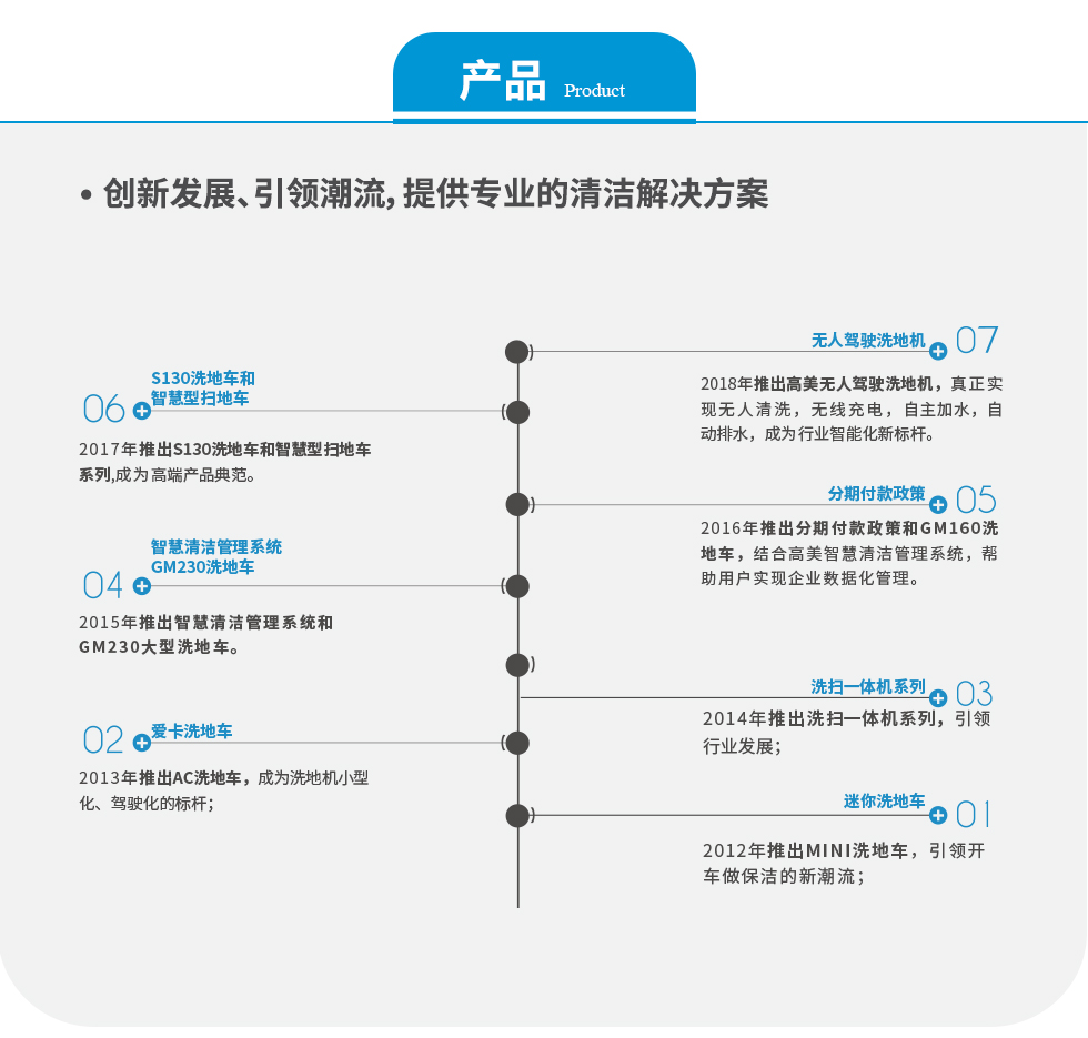 高美能夠為各類商業(yè)或工業(yè)區(qū)域,提供專業(yè)的清潔解決方案。公司主要產(chǎn)品為:洗地機系列、掃地車系列、洗掃一體機系列、商業(yè)機系列。產(chǎn)品遠銷北美、歐洲、澳洲、中東和東南亞等世界各地,深受廣大用戶的歡迎和信賴。