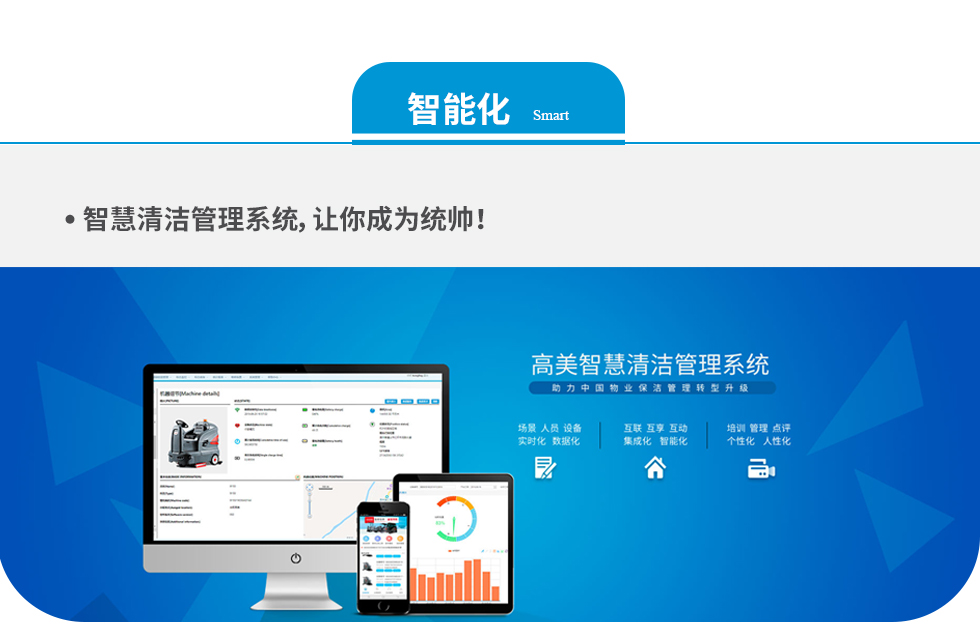 高美,著力打造代表行業(yè)高端專業(yè)化的智慧清潔體驗館。高美智慧清潔管理系統(tǒng)和高端清潔設備,實現(xiàn)場景、人員、設備實時化和數(shù)據(jù)化,結(jié)合互聯(lián)網(wǎng)和大數(shù)據(jù),打造數(shù)據(jù)平臺,讓數(shù)據(jù)賦能企業(yè)。高美以應有的使命和擔當,引領行業(yè)新一輪智能化潮流,為行業(yè)發(fā)展貢獻高美方案。
