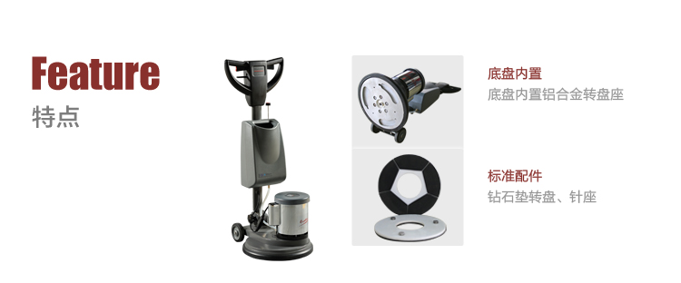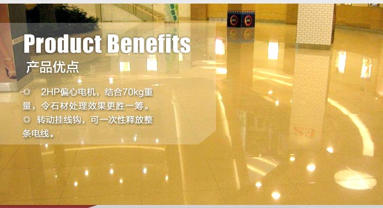 根據力學原理采用偏心電機設計,結合底盤內置鋁合金轉盤座設計,讓操作更輕便;70kg機器凈重,2HP電機扭力強大,令石材處理效果更勝一籌;專為石材翻新和晶面處理而設計。適合賓館、酒店等大面積鋪設石材的場所。